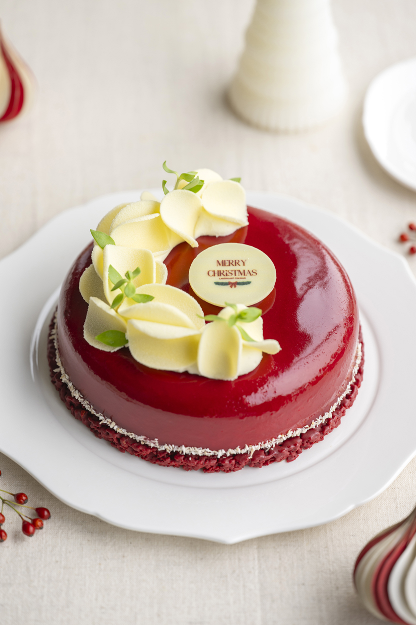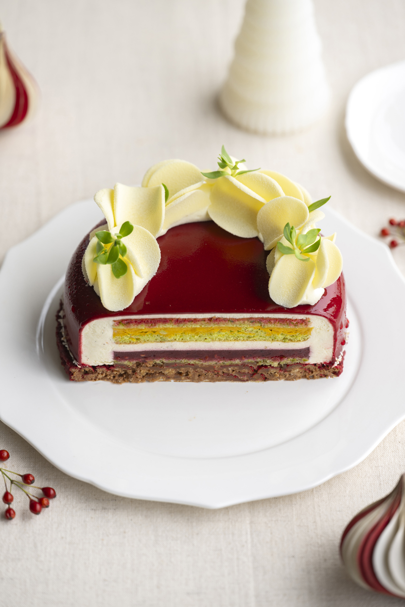 Pistachebiscuit, yoghurt-honingmousse, chocolade- kaneelcrumble, winterse roodfruitcompote, duindoorncremeux