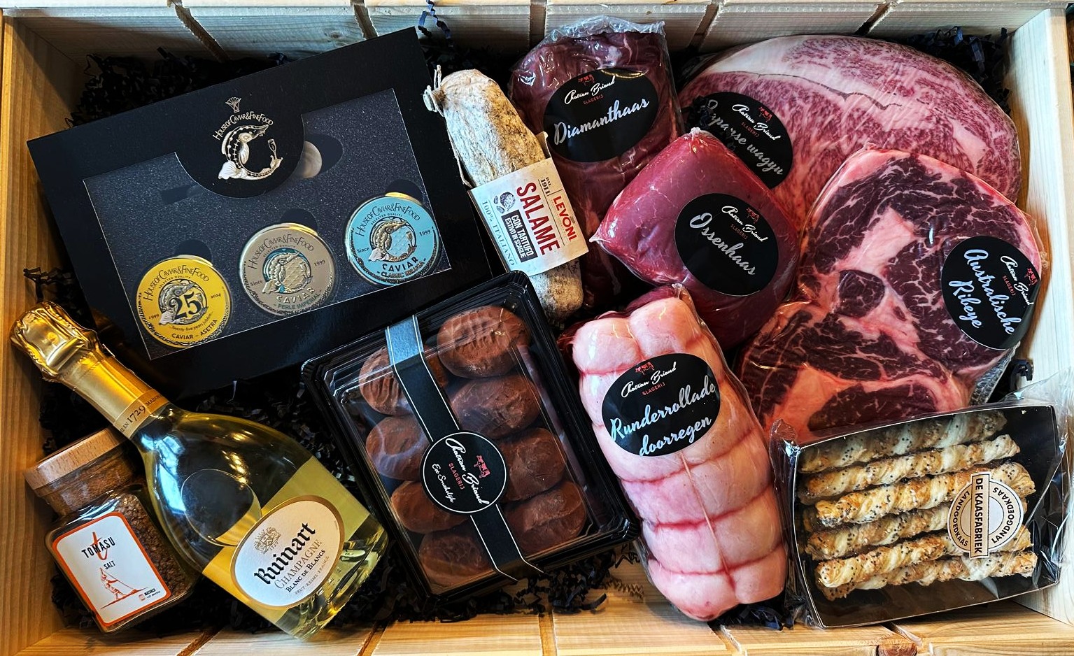 Een feestelijk pakket vol luxe — Wagyu, kaviaar en champagne voor de ultieme culinaire ervaring.