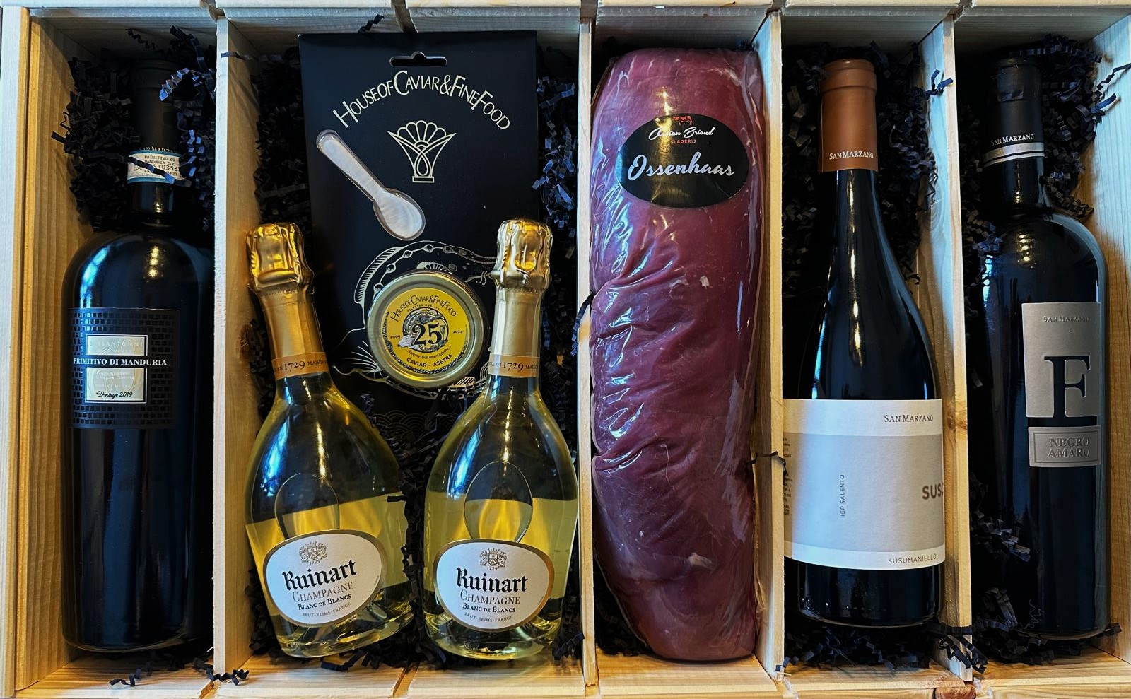 Een exclusieve samenstelling met topwijnen, kaviaar en een hele ossenhaas — perfect voor de echte levensgenieter.
